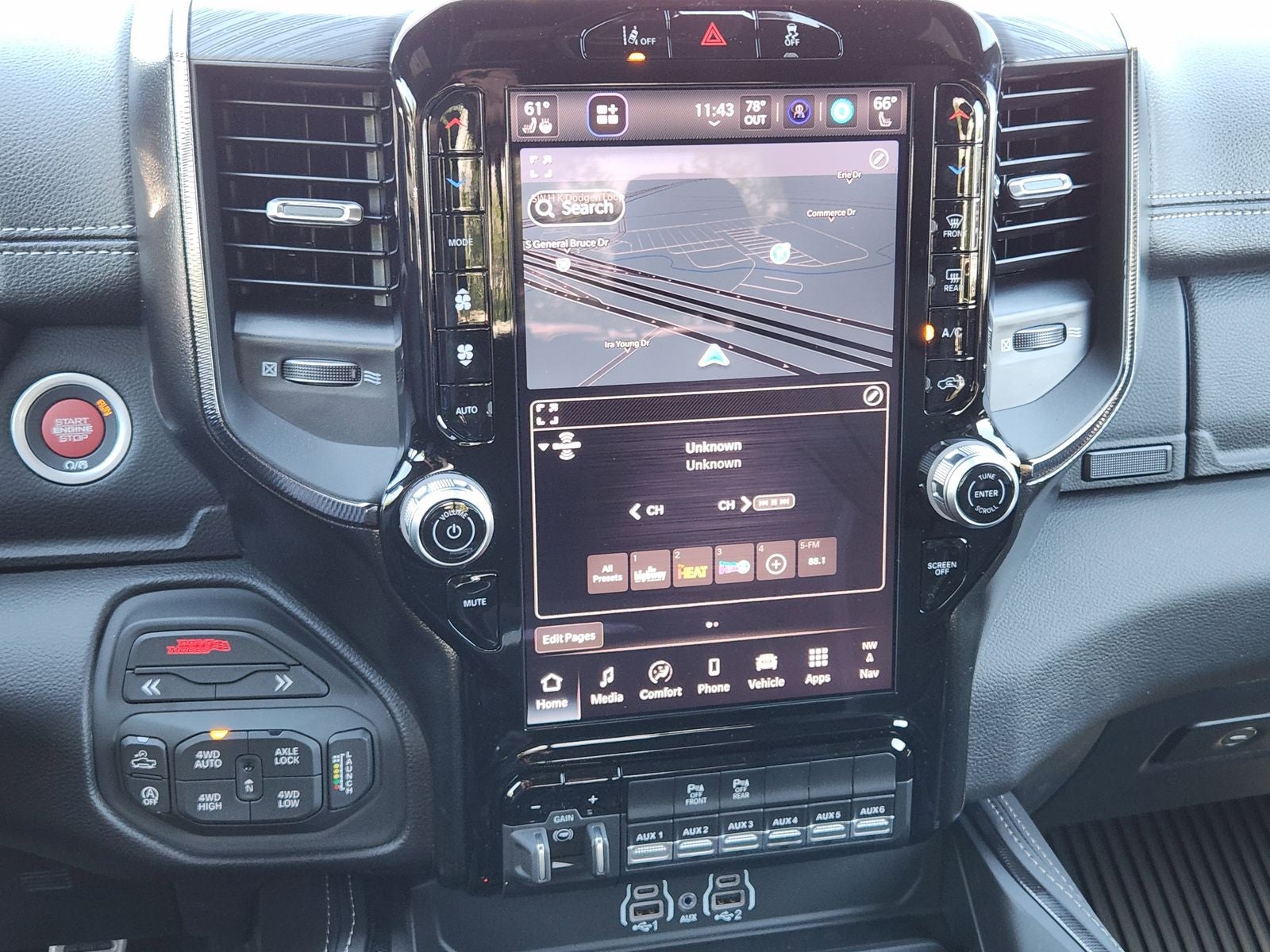 Inside the spacious Crew Cab, performance meets premium comfort. Features include heated front leather bucket seats, a heated flatbottom leather steering wheel, dualzone automatic climate control, and performancefocused design elements throughout the cabin. A 12inch digital instrument cluster integrates seamlessly with Uconnect 5 NAV on a 12inch touchscreen, providing access to Apple CarPlay, Android Auto, SiriusXM 360L, Ram Connect services, and detailed performance pages.