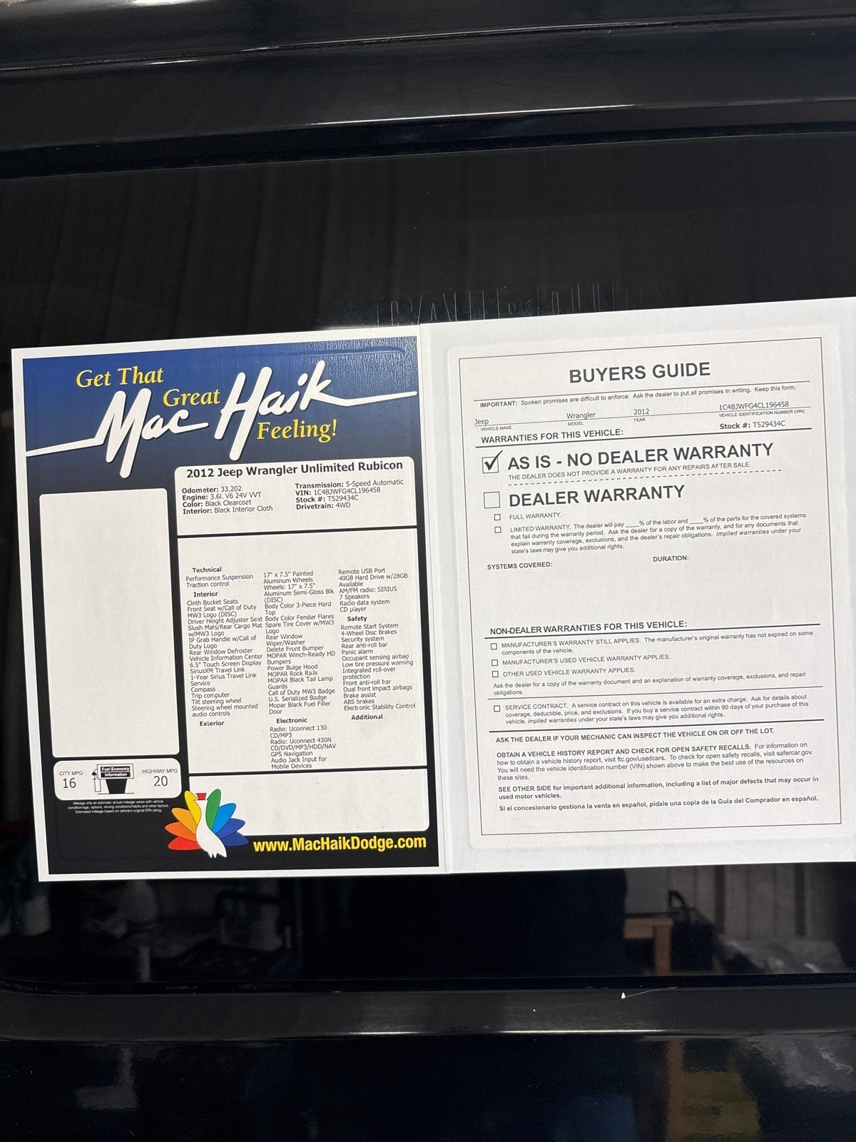 Black Clearcoat 2012 Jeep Wrangler Unlimited Rubicon 4WD 5-Speed Automatic 3.6L V6 24V VVT 4-Wheel Disc Brakes, 7 Speakers, ABS brakes, Air Conditioning, Alloy wheels, Brake assist, Cloth Bucket Seats, Compass, Connectivity Group, Driver Height Adjuster Seat, Electronic Stability Control, Front anti-roll bar, Front Center Armrest w/Storage, Front fog lights, Front Seat Back Map Pockets, Front Seat w/Call of Duty MW3 Logo (DISC), Fully automatic headlights, GPS Navigation, Leather steering wheel, MOPAR Black Tail Lamp Guards, MOPAR Winch-Ready HD Bumpers, Outside temperature display, Panic alarm, Performance Suspension, Power steering, Power windows, Rear Window Wiper/Washer, Remote keyless entry, Security system, Speed control, Steering wheel mounted audio controls, Tilt steering wheel, Traction control, Vehicle Information Center.