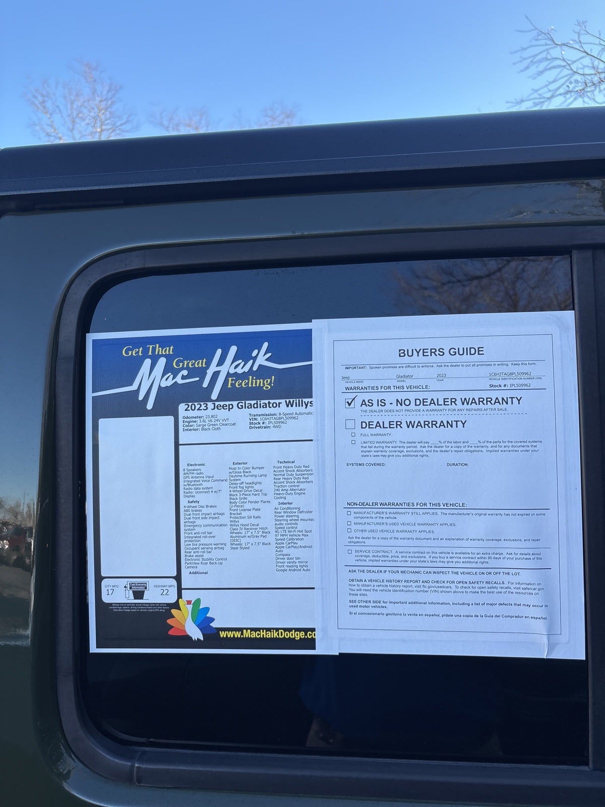 Certified. Sarge Green Clearcoat 2023 Jeep Gladiator Willys 4WD 8-Speed Automatic 3.6L V6 24V VVT 240 Amp Alternator, 4-Wheel Disc Brakes, 4-Wheel Drive Decal, 8 Speakers, Air Conditioning, Apple CarPlay, Apple CarPlay/Android Auto, Black 3-Piece Hard Top, Black Grille, Brake assist, Class IV Receiver Hitch, Daytime Running Lamp System, Deep Tint Sunscreen Windows, Freedom Panel Storage Bag, Front Bucket Seats, Front Heavy Duty Red Accent Shock Absorbers, GPS Antenna Input, Heavy-Duty Engine Cooling, Integrated roll-over protection, Integrated Voice Command w/Bluetooth®, Normal Duty Suspension, ParkView Rear Back-Up Camera, Power steering, Radio: Uconnect 4 w/7 Display, Rear Heavy Duty Red Accent Shock Absorbers, Rear Sliding Window, Rear Window Defroster, Speed control, Steering wheel mounted audio controls, Tilt steering wheel, Traction control, Trailer Hitch Zoom, Trailer Tow Package, Willys, Willys Hood Decal.